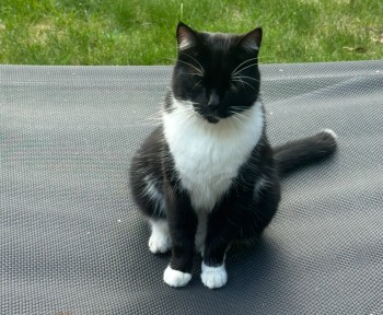 Kot czarno biały z charakterystyczną białą kropką na ogonie