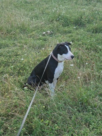 Czarna z białym akcentem. W typie amstafa. Spokojna, może być przestraszona. Nie ma na sobie obroży.