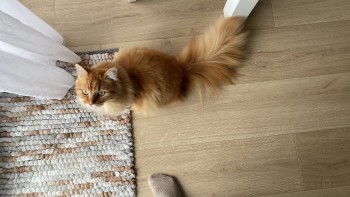 Roczna kotka, umaszczenie ruda z białym, rasa Norweski Leśny.