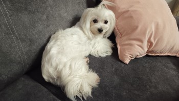 Biały maltańczyk, krótki włos, ubrana w różowe szelki i smycz