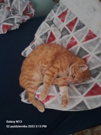 Kocur lat 8. Chudy. (Wygląda młodziej niz w rzeczywistości). Biały krawat, i biały brzuch. Biała mordka. Rudy, w reszcie. Paski ciemniejsze-ppmarańczowe na rudym, już ciele i przez ogon. Ogon troszkę biały,akcenicik. PRĘGOWANY Samiec. Brak dolnego kła. Ukruszył się gdy miał niespełna rok. Kastrowany, chipowany. Wycięty z tego powodu kawalek ucha, w ramach kastrowania. Złote oczy. Białe wibrysy. Dżentelmen. Ufny. Ma minę cierpienia. To jego charakterystyczna cecha. Jest jednak ciepłym, przyjaznym ludziom, kocurem. Bardzo cierpliwym.