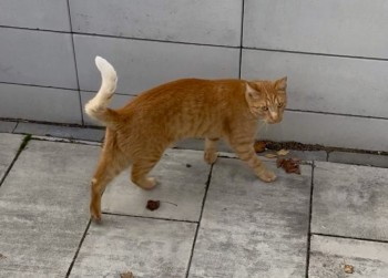 Rudy; bardzo długi kot; boi się innych ludzi, biała końcówka ogona; mała, czarna kropka na środku noska; brak futra przy pazurze na lewej tylnej łapce.