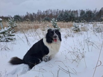 Border Collie. Duży pies. 25 kg. Łapki w cętki. Pyszczek w cętki. Duży biały kołnierz. Obroża zamykana jak pasek, na nim zawieszka w kształcie kończynki. Długa sierść.