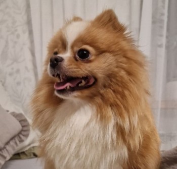 Szpic niemiecki ,młoda ,płochliwa koloru rudego z białym krawatem i białym paskiem na głowie, jest po ciąży wiec straciła dużo podszerstka. Ma na imię Lajla