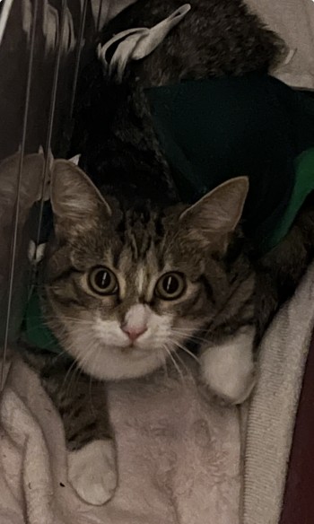 Kotka szaro-bura z białymi łapkami i krawatką. Jest nie śmiała