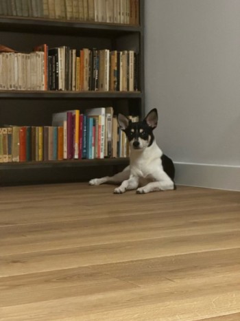 Roczny psiak biało czarny z podpalanymi łapkami.