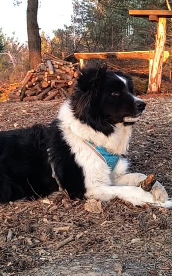 Border collie, umaszczenie biało czarne, miał na sobie niebieskie szelki, przyjazne usposobienie