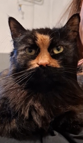 Kotka, szylkretka, długa sierść, na pysku bardzo charakterystyczna jasnobrązowa plama w kształcie dziobu / nosa wyróżniająca się na tle reszty czarnej sierści.