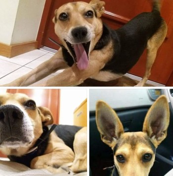 Odi. Wygląda jak mały (12kg) owczarek niemiecki krótkowłosy, czarny podpalany z dużymi uszami. Miał niebieską obróżkę.