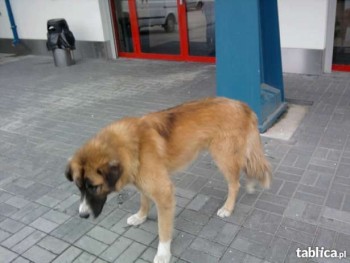 Duży szczeniak. Bardzo przyjazny. Rudy z biało-czarnym pyszczkiem.Uszy klapnięte.