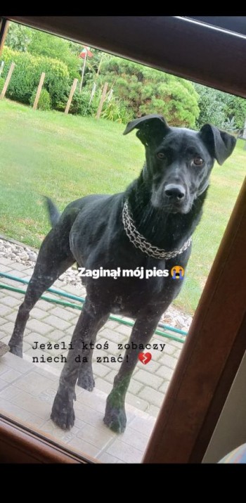 Spory (powyzej kolana) czarny pies w typie labradora. Wąski ogon ala pejcz.