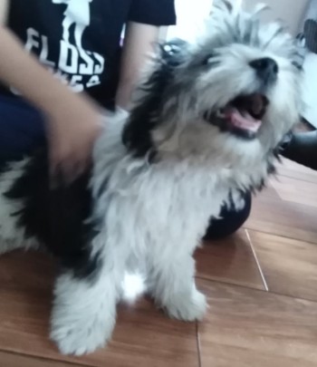 Mix maltańczyka i yorka. Długi włos, czarno-biały.