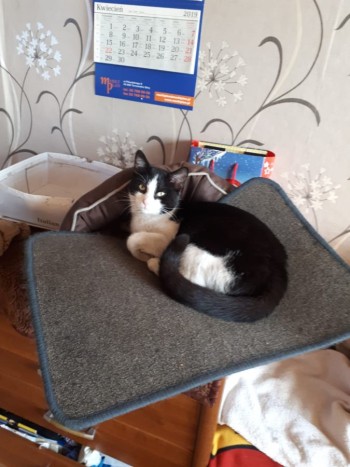 Młody kocurek w kwietniu skończy rok ma biały pyszczek i czarne plamy na oczach i uszach łapki białe grzbiet z ogon czarny. Jest plochliwy i mało ufny