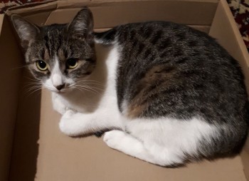 Drobna, buro-biała kotka z pomarańczową obróżką z dzwonkiem.