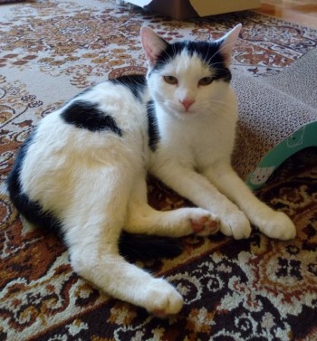 biało-czarne umaszczenie, żółte oczy, różowy nosek, na grzbiecie czarny "płaszczyk", ogon czarny, na prawym boku dwie charakterystyczne czarne łatki (kropeczki), ma 3 lata (może wydawać się młodsza ponieważ jest drobnej budowy), jest wysterylizowana