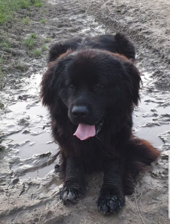 Duży czarny pies około 70 kg wagi. Ma widoczne brązowe przebarwienia sierści.