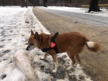 Średniej wielkości pies maści rudo - białej (białe skarpetki) i zakręcony ogon. Łagodny. Jest płochliwy i nieufny, raczej nie podejdzie. Miał na sobie szelki w kolorze czarnym, do nich przyczepiona adresówka (imię i nr telefonu). Widziany na ulKomorskiej.