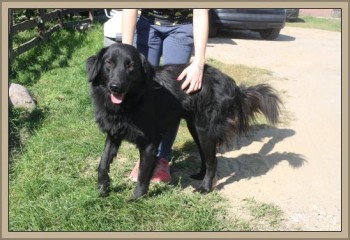 Duży czarny półdługowłosy pies, urodą przypominający psa w typie Hovawart.