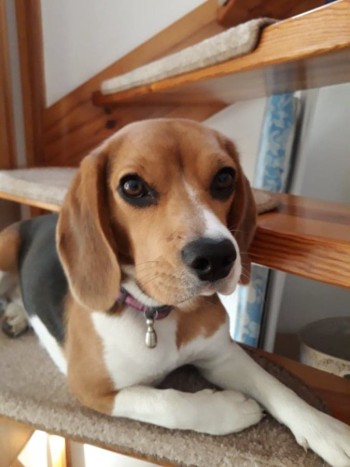 Suczka o imieniu Florka, z czerwonymi szelkami i różową obróżką