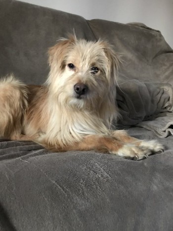 Średniej wielkości pies, sierść długa, maść kremowa. Boi się ludzi, bardzo lękliwy.