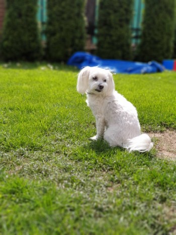 Biały maltańczyk-suczka, wabi się Pusia, przystrzyżona, z dłuższymi włosami na uszach. Bardzo pogodna.
