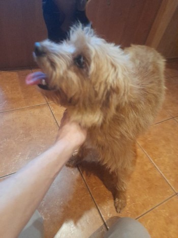 Rudy, kudłaty,średniej długości sierść, wielkość średnia,czerwona obroża,przyjazny ,miziasty