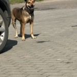 Wyrzucona z auta pod sklepem. Suka, młoda. Ma na sobie obroże p/ pchelną. Nie chcę podejść.