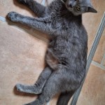 kotek mały, chudy, ufny, zadomowiony, z szara obroża bez danych,
