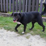 czarny pies, 4 białe skarpetki i biały krawat. nie boi się ludzi i innych psów