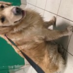 Pies ma czerwoną obrożę, nie boi się ludzi nawet daje łapę.