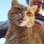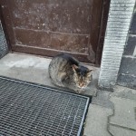 Szary kot z czarną pręgą na grzbiecie. Miauczy i szuka kontaktu