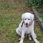 Młody biały pies dużej rasy, podobny do owczarka podhalańskiego. Ma obrożę ale bez żadnej adresówki.