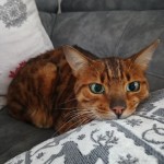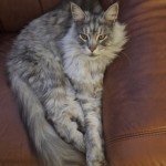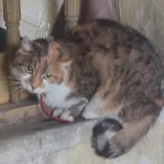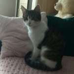 Kotka jest zadbana i oswojona i jest w kolorze szaro-białym. Ma znak szczególny pod policzkiem ma plamę jakby była brudna.