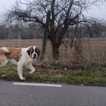 Pies w typie Bernardynka, nie wiem jaka płeć, pies ucieka.
