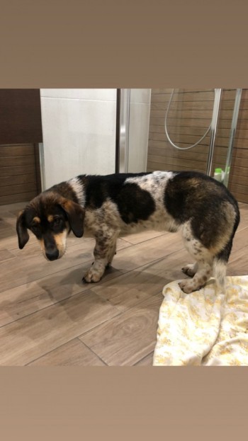 Mały kundelek o wydłużonym tułowiu jak jamnik jednak o grubszej posturze. Buro biały z nakrapianymi łapkami.