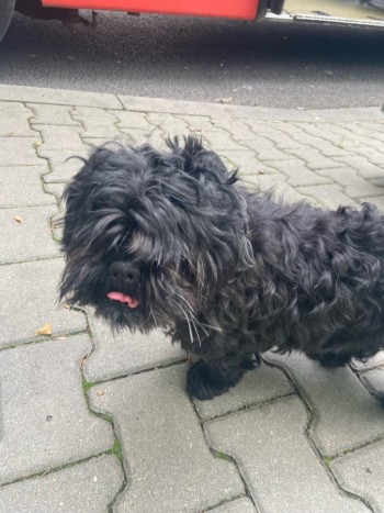 Czarny pies, około 5kg ma obroże błąka się po końcowym na potkanowie