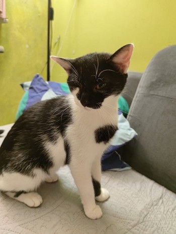 W polu kukurydzy został znaleziony kot o maści biało - czarnej, sierść krótka. Kot został zbadany przez weterynarza - jest to kastrat w wieku oszacowanym na dwa lata. Jest bardzo gadatliwy - dużo miauczy, wybredny na kocie jedzenie, ale chętnie ukradnie suchą bułkę. Bardzo łasi się do ludzi, uwielbia mizianie. Nie posiada niestety mikroczipa.