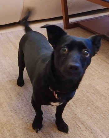 Czarna, mała suczka, różowa obróżka w kwiatki. Biały ktawat.