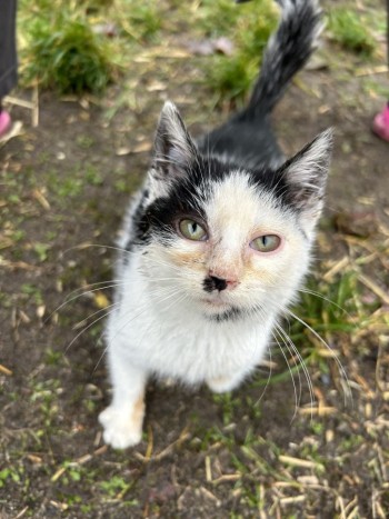 Kot ma około 3 miesiące. Ktoś wyrzucił go w lesie. Uwielbia głaskanie, mizianie i ogólny kontakt z człowiekiem. Widać, że był w domu. Jest grzeczny. Ma koci Katar, ale leczony. Byliśmy u weterynarza, przyjął antybiotyk i bierze tabletki.