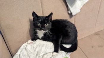 kot bardzo przyjazny oswojony, czysty, czarny z białym krawatem i skarpetkami