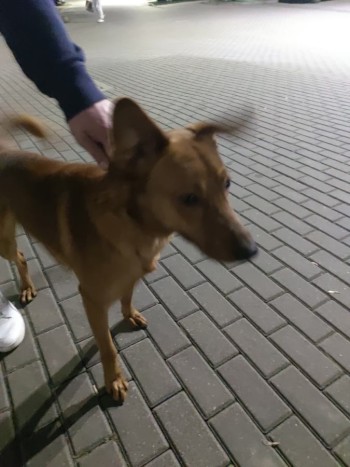 Brązowy młody pies średniej wielkości, szczupły, energiczny