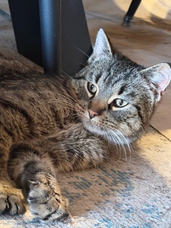 Znaleziony w godzinach wieczornych w Popielawach. Średniej wielkości, pręgowany. Bardzo przyjazny i towarzyski.